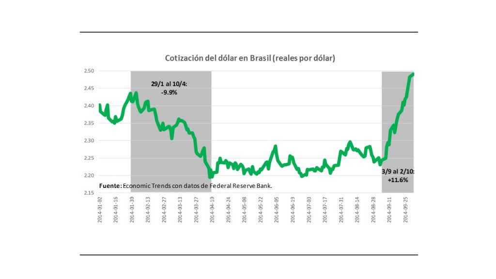 Pero desde comienzos de septiembre, el dólar en Brasil ha estado subiendo, y eso complica nuestro frente cambiario. La suba fue del 11.6% en sólo un mes. Con esa suba, el tipo de cambio en Brasil está hoy en su máximo en lo que va del año.
