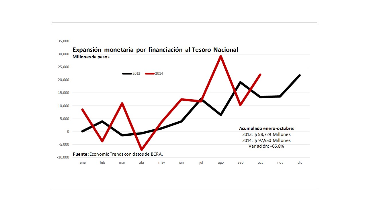 Y ocurrió. El BCRA emitió durante octubre $ 21,984 millones para prestarle al Tesoro (había emitido $ 13,407 millones durante octubre del año pasado), como muestra el primer gráfico de la nota.