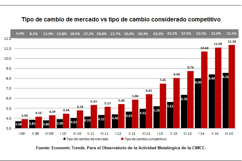 La brecha entre el tipo de cambio oficial y el tipo de cambio considerado competitivo por los industriales metalúrgicos se mantiene en torno al 32%, muy por encima del 6% registrado a comienzos de 2009, aunque por debajo de los niveles registrados durante 2013.
