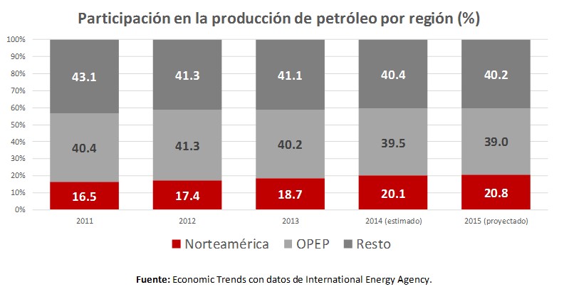 Ocurre que la OPEP decidió, en su reunión de fines de noviembre, mantener sus volúmenes de producción, a pesar de la sobreoferta mundial, para revertir el proceso de pérdida de participación generado por el fuerte crecimiento de la producción en Estados Unidos y Canadá, como muestra el gráfico.