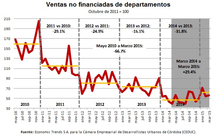 El Índice de Ventas de Inmuebles en Córdoba de la Cámara Empresarial de Desarrollistas Urbanos (CEDUC), única estadística en el país que mide ventas efectivamente realizadas, independientemente de si fueron escrituradas o no, muestra que la caída observada en las ventas de departamentos y casas durante 2011, 2012 y 2013 parece haberse detenido en 2014, mostrando una leve tendencia positiva durante los últimos meses.