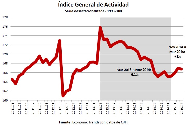 De esta forma, la actividad económica cayó 6.1% entre marzo de 2013 y noviembre de 2014 y se recuperó luego 1% entre noviembre de 2014 y marzo de 2015.