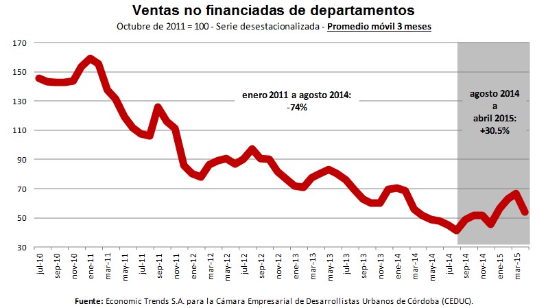 Como muestra el gráfico, las ventas de departamentos al contado o con financiaciones a menos de 3 años, una vez corregida la estacionalidad (para aislar fluctuaciones propias de cada mes) y tomando promedios móviles de 3 meses (para evitar la volatilidad que muestran las ventas mes a mes), surge claramente una tendencia negativa entre enero de 2011 y agosto de 2014, con una caída del 74%, y una recuperación desde entonces hasta abril de este año, con una recuperación del 30.5%.