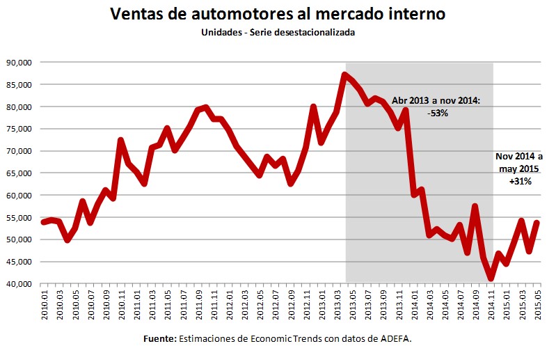 Las ventas de automotores al mercado interno, que cayeron 53% entre abril de 2013 y noviembre de 2014, con el grueso de esa caída concentrado en los primeros 3 meses del año pasado, muestran una recuperación desde noviembre, acumulando una suba del 31% desde entonces (según las estadísticas desestacionalizadas, para que tengan sentido tales comparaciones).