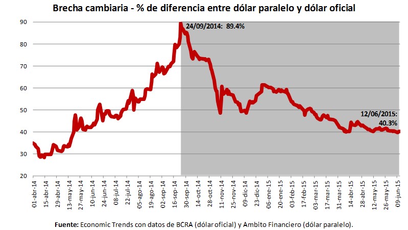 Con la fuerte suba del dólar paralelo entre abril y septiembre de 2014, desde poco más de $ 10 hasta casi $ 16, la brecha cambiaria (la diferencia entre el dólar paralelo y el dólar oficial) alcanzó casi el 90% a fines de septiembre.