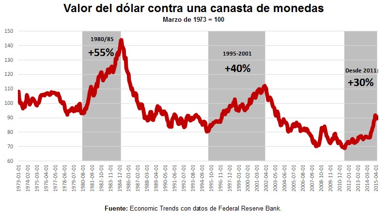 Y actualmente está produciéndose una nueva apreciación del dólar, acumulando 30% de suba desde mediados de 2011.