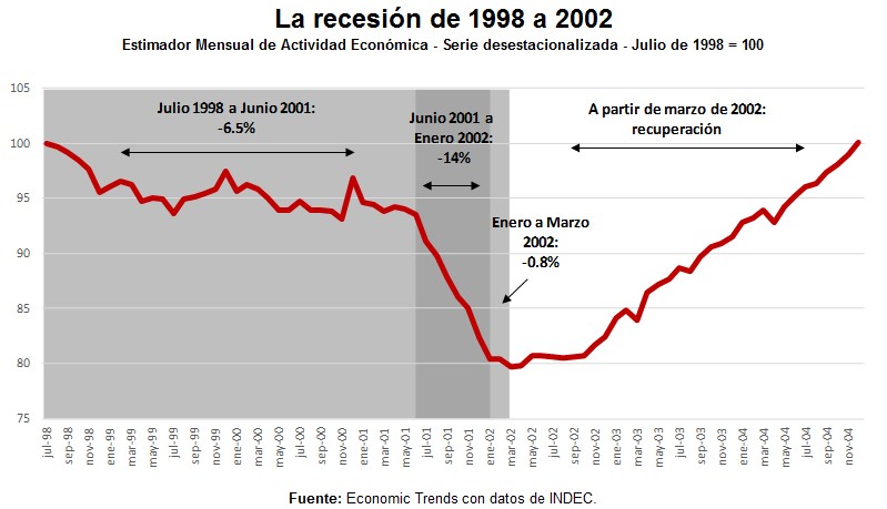 Ocurre que si se analizan números anuales, la actividad económica de 2002 estuvo un 10% por debajo del nivel del año previo, pero no porque la actividad económica haya caído ese año, sino porque había caído previamente, a fines de 2001, dejando así el nivel de 2002 muy por debajo del promedio de 2001.