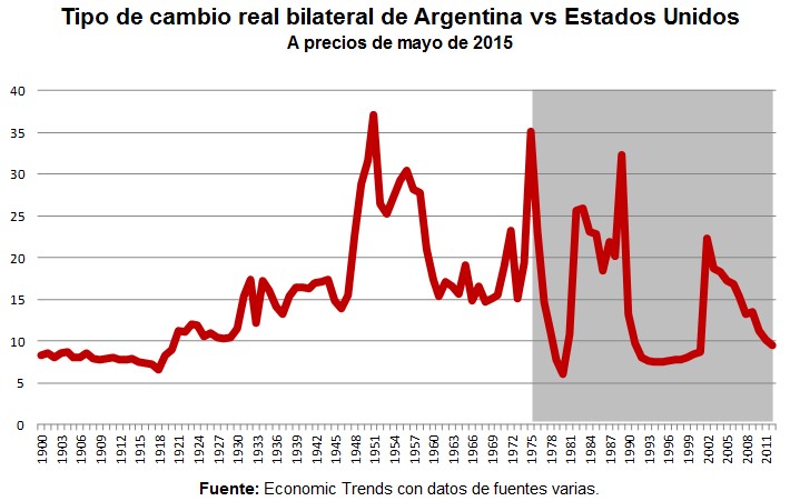 El gráfico muestra cómo a mediados de los ’70, el tipo de cambio real equivalía a lo que hoy serían 35 pesos por dólar, muy favorable para las actividades productoras de bienes transables, como es el caso de la industria, para tener 5 años después un tipo de cambio real equivalente a sólo 5 pesos por dólar, muy desfavorable para la industria, y así sucesivamente, con períodos alternados de tipo de cambio alto y bajo.