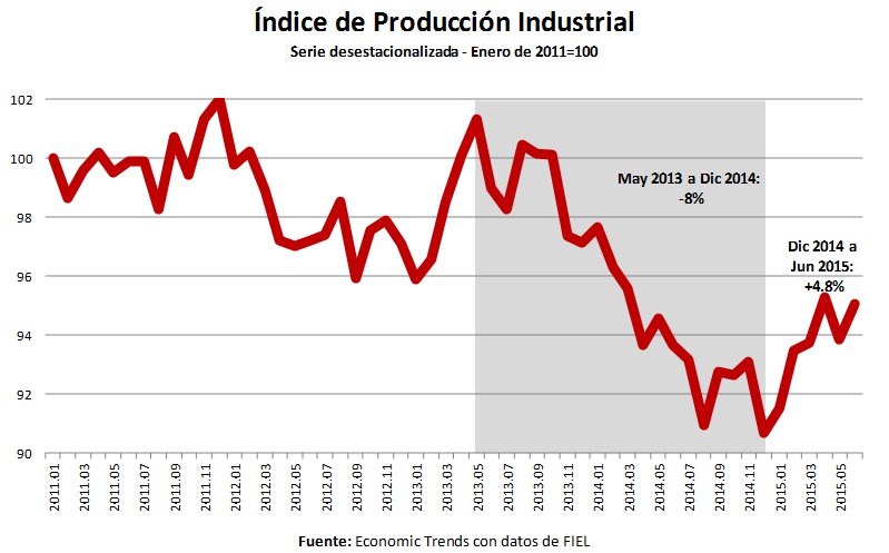 Luego de una caída del 8% entre mayo de 2013 y diciembre de 2014, la producción industrial nacional se ha incrementado durante lo que va del año, acumulando una suba del 4.8% entre diciembre de 2014 y junio de 2015.