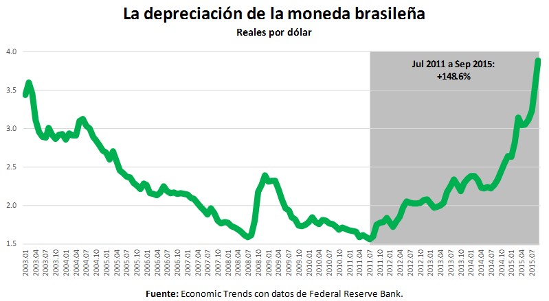 A este fenómeno común en el mundo, en Brasil se suma su crisis política, que se está traduciendo en una fortísima suba del dólar, que acumula casi 150% desde mediados de 2011, cuando comenzó en Argentina la tendencia al atraso cambiario.