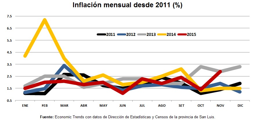 En noviembre, la inflación subió nuevamente, alcanzando el 2.9% mensual, el mayor valor de 2015, y el mayor valor, para el mes de noviembre, de los 4 años previos (excepto noviembre de 2013, cuando también alcanzó el 2.9%, mientras se aceleraba la suba del dólar oficial).