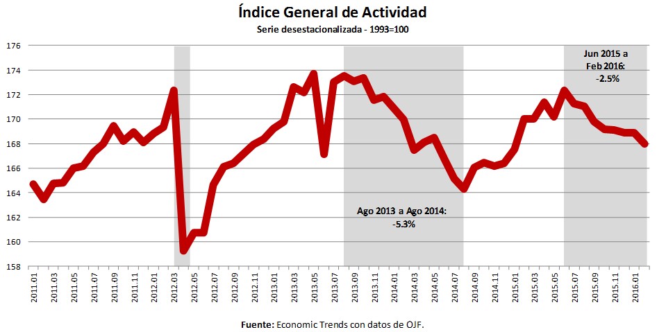 Luego de la recuperación posterior a la caída producida entre agosto de 2013 y agosto de 2014, la actividad económica nuevamente está cayendo desde mediados de 2015, acumulando una caída del 2.5% entre junio de 2015 y febrero de 2016.