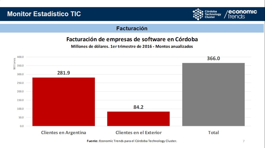Según el Monitor Estadístico TIC, del Córdoba Technology Cluster, las empresas de software de la provincia de Córdoba vendieron, durante el primer trimestre de 2016, un total anualizado de u$s 366 millones, compuestos en un 77% por ventas a clientes en Argentina (u$s 281.9 millones) y en un 23% por ventas a clientes en el exterior (u$s 84.2 millones).
