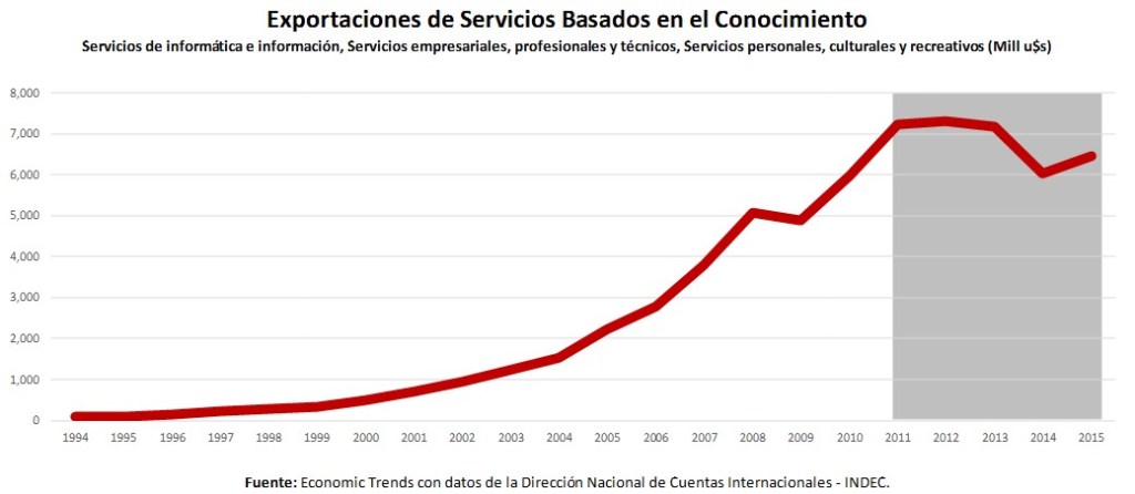 En Argentina, durante los últimos 20 años, estas exportaciones de servicios basados en conocimiento crecieron fuertemente, a un ritmo de alrededor del 24% anual, pero se estancaron desde 2012, sin recuperar todavía los niveles de 2011.