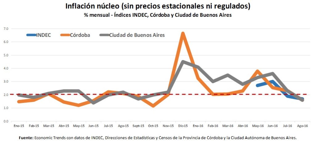 La inflación núcleo, que excluye precios regulados y precios estacionales, estuvo en agosto entre 1.6% y 1.7% mensual, equivalente a entre 21% y 22% anual.