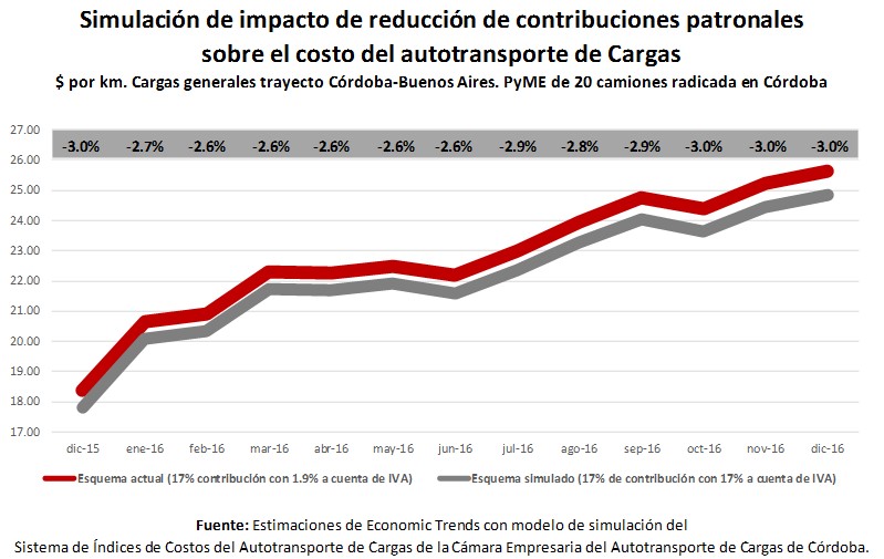 Para una PyME con 20 camiones, radicada en la ciudad de Córdoba, dedicada a cargas generales para el trayecto Córdoba-Buenos Aires, con un 70% de utilización de su flota de camiones, tomar la totalidad de la contribución patronal al sistema previsional implica una reducción del 3% de los costos totales con datos a diciembre de 2016.