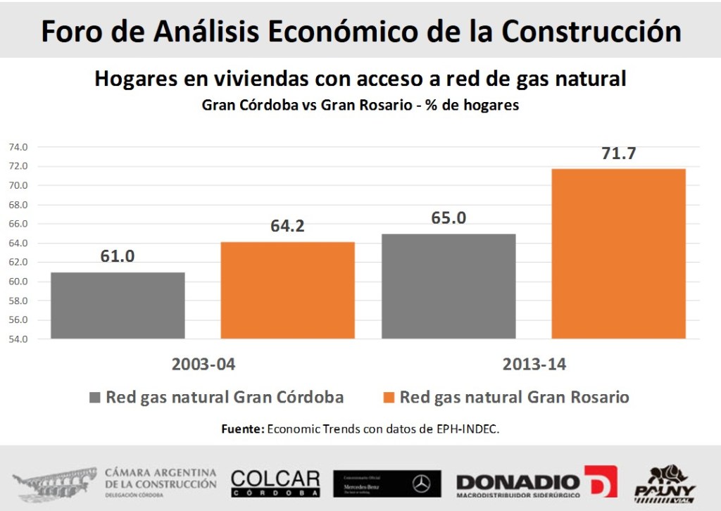 Los números de la Encuesta Permanente de Hogares (EPH) muestran que en 2003-04, el 61% de los hogares del Gran Córdoba tenía acceso a redes de gas natural, y 10 años después esa situación apenas había mejorado, alcanzando el 65%.