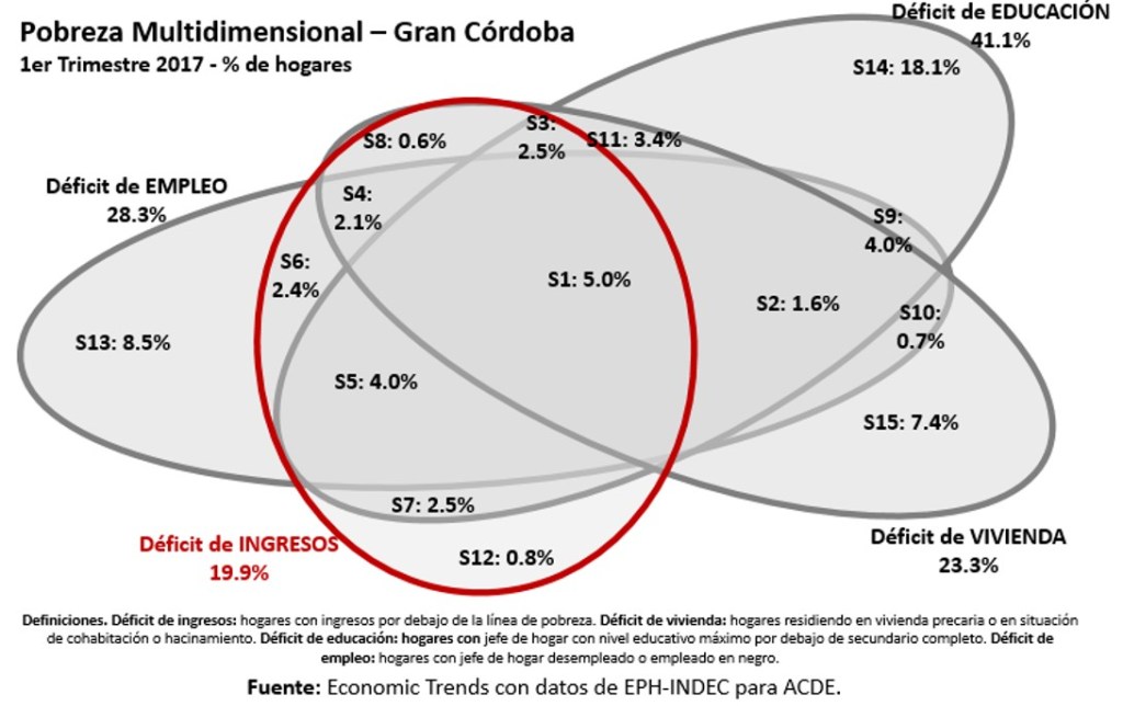 El gráfico muestra, con números del primer trimestre de 2017, para el Gran Córdoba, todas las intersecciones entre cuatro dimensiones: