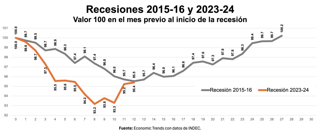 Medida desde ese momento, la caída duró sólo 3 meses, entre febrero y abril de 2024, y la recuperación posterior casi alcanzó el valor inicial, de dic’23. El dado de septiembre seguramente mostrará que la actividad económica ha sobrepasado el nivel de dic’23.