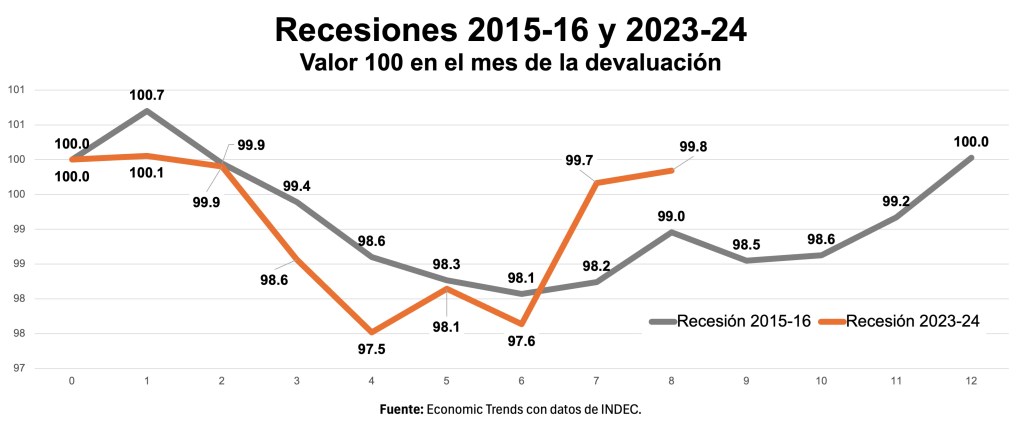 El gráfico 1 muestra la evolución del EMAE (Estimador Mensual de Actividad Económica, serie desestacionalizada) desde el inicio de la recesión 2023-24, en agosto de 2023 (línea naranja) y, superpuesto, desde el inicio de la recesión 2015-16, en junio de 2015 (línea gris), en ambos casos partiendo del valor 100 en el mes 0 (mes previo al inicio de la caída de actividad).