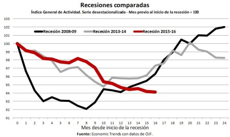 Con los números de octubre, la actual recesión acumula una caída del 5.3% durante los últimos 16 meses, el año cerrará con una caída cercana al 2.9% y la eventual recuperación durante 2017 seguramente no alcanzará el 3.5%.