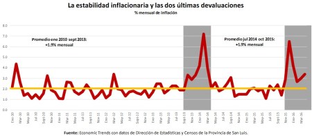 La inflación ha sido muy estable en los últimos años, en torno al 1.9% mensual, acelerándose con las devaluaciones de 2014 y 2015. Es probable que regrese a un ritmo cercano al 2% mensual cuando pase el efecto de la última devaluación y los aumentos de tarifas.