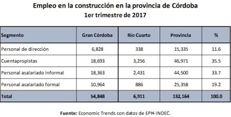 “El sector de la construcción es importante en Córdoba, ya que representa 7.7% del producto provincial. Pero es más importante por el empleo que genera (8.9% del total), y más importante aún por el desempleo que puede absorber (21.6% del total, 26.4% en el segmento de jefes de hogar)”