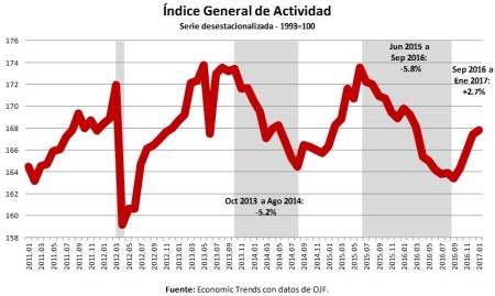 Durante los últimos 3 meses de 2016, la actividad económica se recuperó un 2.3%, un porcentaje elevado para un periodo tan corto, luego de 15 meses de caída. Señal de que la recesión, más prolongada y profunda que las 2 anteriores, puede haber quedado atrás.