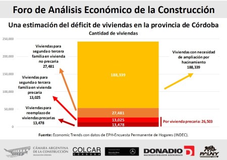 La provincia de Córdoba necesita 26,500 nuevas viviendas para eliminar habitación y cohabitación en viviendas precarias y 27,500 nuevas viviendas para eliminar cohabitación en viviendas no precarias. Además, 188,300 viviendas requieren ampliación para eliminar situaciones de hacinamiento.