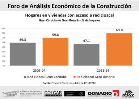 Mientras la red de agua corriente alcanza a prácticamente el 100% de los hogares en el Gran Córdoba, las redes cloacales y de gas natural alcanzan sólo al 47.1% y 65% de los hogares, por debajo de los niveles registrados en Rosario.