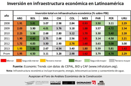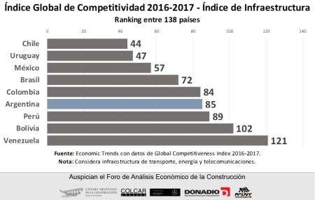 Considerando calidad de infraestructura económica, Argentina ocupa el puesto 85 entre 138 países en el Índice Global de Competitividad, por debajo de Chile, Uruguay, México, Brasil y Colombia. Datos que muestran por qué es tan urgente aumentar la inversión en infraestructura.