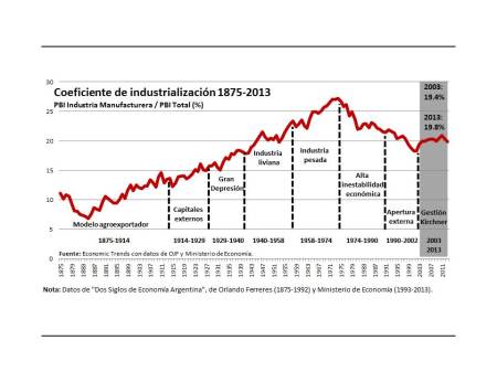 La participación de la industria en la economía nacional aumentó entre 1885 y 1974, impulsada por distintas políticas industriales, proceso que se revirtió desde entonces.